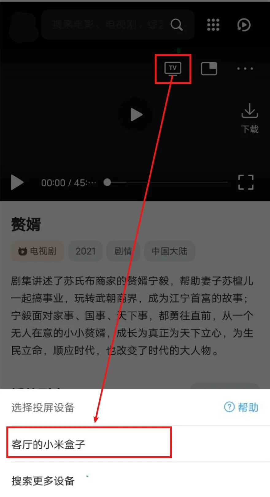 打开QQ浏览器(会接管网页播放器)->打开77700影视->播放视频->选中投屏图标->等待搜寻出智能电视/电视盒子->选中,即可投屏。